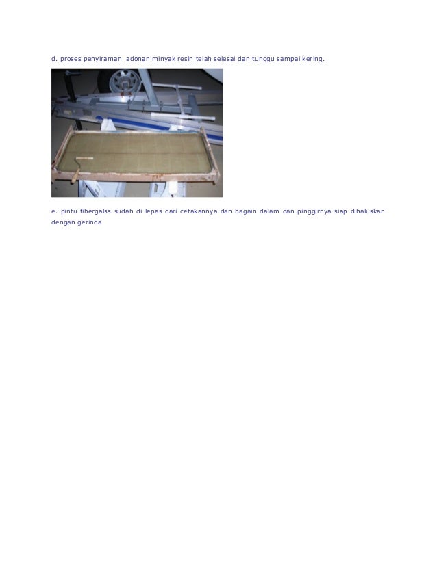 - 10. d. proses penyiraman adonan minyak resin telah selesai dan tunggu sampai kering. e. pintu fibergalss sudah di lepas dari cetakannya dan bagain dalam dan pinggirnya siap dihaluskan dengan gerinda.