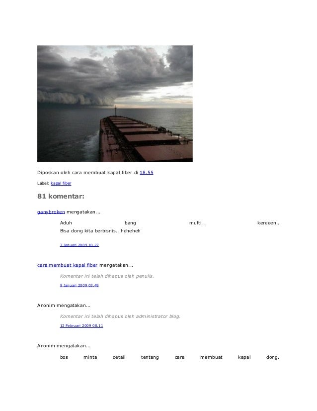 - 13. Diposkan oleh cara membuat kapal fiber di 18.55 Label: kapal fiber 81 komentar: ganybroken mengatakan... Aduh bang mufti.. kereeen.. Bisa dong kita berbisnis.. heheheh 7 Januari 2009 10.27 cara membuat kapal fiber mengatakan... Komentar ini telah dihapus oleh penulis. 8 Januari 2009 03.49 Anonim mengatakan... Komentar ini telah dihapus oleh administrator blog. 12 Februari 2009 08.11 Anonim mengatakan... bos minta detail tentang cara membuat kapal dong.