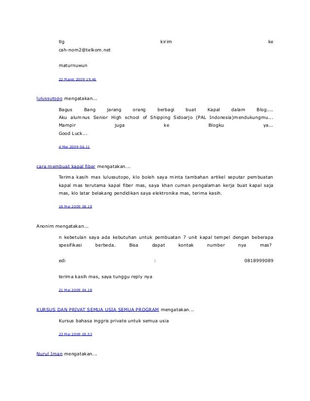 - 14. tlg kirim ke cah-nom2@telkom.net maturnuwun 22 Maret 2009 19.46 lulussutopo mengatakan... Bagus Bang jarang orang berbagi buat Kapal dalam Blog.... Aku alumnus Senior High school of Shipping Sidoarjo (PAL Indonesia)mendukungmu... Mampir juga ke Blogku ya... Good Luck... 4 Mei 2009 06.11 cara membuat kapal fiber mengatakan... Terima kasih mas lulussutopo, klo boleh saya minta tambahan artikel seputar pembuatan kapal mas terutama kapal fiber mas, saya khan cuman pengalaman kerja buat kapal saja mas, klo latar belakang pendidikan saya elektronika mas, terima kasih. 18 Mei 2009 08.18 Anonim mengatakan... n kebetulan saya ada kebutuhan untuk pembuatan 7 unit kapal tempel dengan beberapa spesifikasi berbeda. Bisa dapat kontak number nya mas? edi : 0818999089 terima kasih mas, saya tunggu reply nya 21 Mei 2009 04.18 KURSUS DAN PRIVAT SEMUA USIA SEMUA PROGRAM mengatakan... Kursus bahasa inggris private untuk semua usia 23 Mei 2009 05.53 Nurul Iman mengatakan...