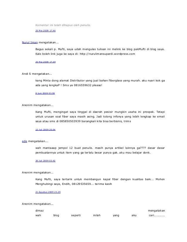 - 15. Komentar ini telah dihapus oleh penulis. 25 Mei 2009 17.46 Nurul Iman mengatakan... Bagus sekali p. Mufti, saya udah mengulas tulisan ini melink ke blog pakMufti di blog saya. Kalo boleh link juga ke saya di: http://nurulimansupardi.wordpress.com 25 Mei 2009 17.49 Andi S mengatakan... kang Minta dong alamat Distributor yang jual bahan fiberglass yang murah. aku nyari kok ga ada yang lengkaP ! Sms ya 0816559632 please! 8 Juni 2009 03.59 Anonim mengatakan... Kang Mufti, mengingat saya tinggal di daerah pesisir mungkin usaha ini prospek. Tetapi untuk urusan soal fiber saya masih asing. Jadi tolong infonya yang lebih lengkap ke email saya atau sms di 085850503939 barangkali kita bisa berbisnis, trims 12 Juli 2009 20.04 ade mengatakan... wah mantaaap jempol 12 buat penulis. masih punya artikel lainnya ga???? dasar dasar pembuatannya untuk item yang ga terlalu besar punya gak. aku mau belajar donk. 30 Juli 2009 03.42 Anonim mengatakan... Kang Mufti, saya tertarik untuk membangun kapal fiber dengan kualitas baik... Mohon Menghubingi saya, Endih, 08129535659... terima kasih 21 Agustus 2009 23.29 Anonim mengatakan... dimaz mengatakan wah blog seperti inilah yang aku cari...........
