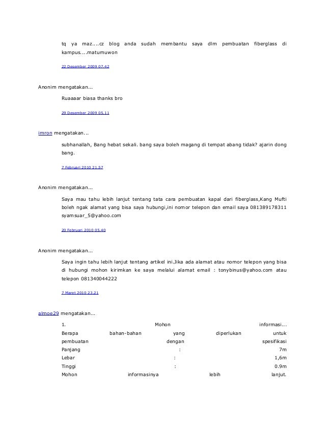 - 16. tq ya maz....cz blog anda sudah membantu saya dlm pembuatan fiberglass di kampus....maturnuwon 22 Desember 2009 07.42 Anonim mengatakan... Ruaaaar biasa thanks bro 29 Desember 2009 05.11 imron mengatakan... subhanallah, Bang hebat sekali. bang saya boleh magang di tempat abang tidak? ajarin dong bang. 7 Februari 2010 21.57 Anonim mengatakan... Saya mau tahu lebih lanjut tentang tata cara pembuatan kapal dari fiberglass,Kang Mufti boleh ngak alamat yang bisa saya hubungi,ini nomor telepon dan email saya 081389178311 syamsuar_5@yahoo.com 20 Februari 2010 05.40 Anonim mengatakan... Saya ingin tahu lebih lanjut tentang artikel ini.Jika ada alamat atau nomor telepon yang bisa di hubungi mohon kirimkan ke saya melalui alamat email : tonybinus@yahoo.com atau telepon 081340044222 7 Maret 2010 23.21 almoe29 mengatakan... 1. Mohon informasi... Berapa bahan-bahan yang diperlukan untuk pembuatan dengan spesifikasi Panjang : 7m Lebar : 1,6m Tinggi : 0.9m Mohon informasinya lebih lanjut.