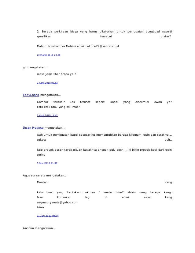 - 17. 2. Berapa perkiraan biaya yang harus dikelurkan untuk pembuatan Longboad seperti spesifikasi tersebut diatas? Mohon Jawabannya Melalui emai : almoe29@yahoo.co.id 23 Maret 2010 22.56 gh mengatakan... masa jenis fiber brapa ya ? 2 April 2010 06.53 EddyChang mengatakan... Gambar terakhir kok terlihat seperti kapal yang diselimuti awan ya? Foto efek atau yang asli mas? 9 April 2010 14.42 Ihsan Prawoto mengatakan... wah untuk pembuatan kapal sebesar itu membutuhkan berapa kilogram resin dan serat ya... sukses deh.. kalo proyek besar kayak gituan kayaknya enggak dulu dech.... kl bikin proyek kecil dari resin sering 5 Juni 2010 21.32 Agus suryanata mengatakan... Mantap Kang kalo buat yang kecil-kecil ukuran 3 meter kira2 abisin uang berapa kang. bisa komentar lagi di email saya kang aagussuryanata@yahoo.com trims 11 Juni 2010 00.04 Anonim mengatakan...