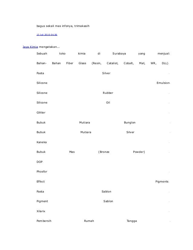 - 18. bagus sekali mas infonya, trimakasih 13 Juli 2010 04.56 Jaya Kimia mengatakan... Sebuah toko kimia di Surabaya yang menjual: Bahan- Bahan Fiber Glass (Resin, Catalist, Cobalt, Mat, WR, DLL)﹑ Pasta Silver ﹑ Silicone Emulsion﹑ Silicone Rubber ﹑ Silicone Oil ﹑ Glitter ﹑ Bubuk Mutiara Bunglon ﹑ Bubuk Mutiara Silver ﹑ Kaneka ﹑ Bubuk Mas (Bronze Powder) ﹑ DOP﹑ Phosfor ﹑ Effect Pigments﹑ Pasta Sablon ﹑ Pigment Sablon ﹑ Xilarix ﹑ Pembersih Rumah Tangga ﹑