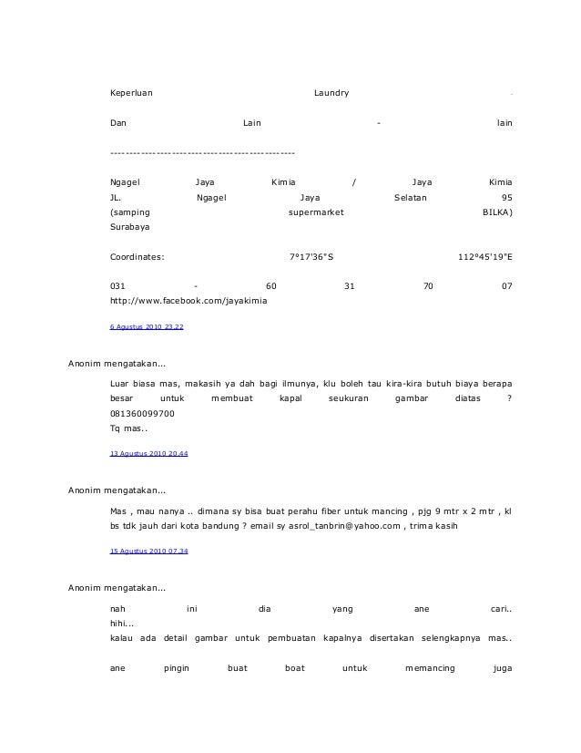 - 19. Keperluan Laundry ﹑ Dan Lain - lain ------------------------------------------------ Ngagel Jaya Kimia / Jaya Kimia JL. Ngagel Jaya Selatan 95 (samping supermarket BILKA) Surabaya Coordinates: 7°17'36"S 112°45'19"E 031 - 60 31 70 07 http://www.facebook.com/jayakimia 6 Agustus 2010 23.22 Anonim mengatakan... Luar biasa mas, makasih ya dah bagi ilmunya, klu boleh tau kira-kira butuh biaya berapa besar untuk membuat kapal seukuran gambar diatas ? 081360099700 Tq mas.. 13 Agustus 2010 20.44 Anonim mengatakan... Mas , mau nanya .. dimana sy bisa buat perahu fiber untuk mancing , pjg 9 mtr x 2 mtr , kl bs tdk jauh dari kota bandung ? email sy asrol_tanbrin@yahoo.com , trima kasih 15 Agustus 2010 07.34 Anonim mengatakan... nah ini dia yang ane cari.. hihi... kalau ada detail gambar untuk pembuatan kapalnya disertakan selengkapnya mas.. ane pingin buat boat untuk memancing juga