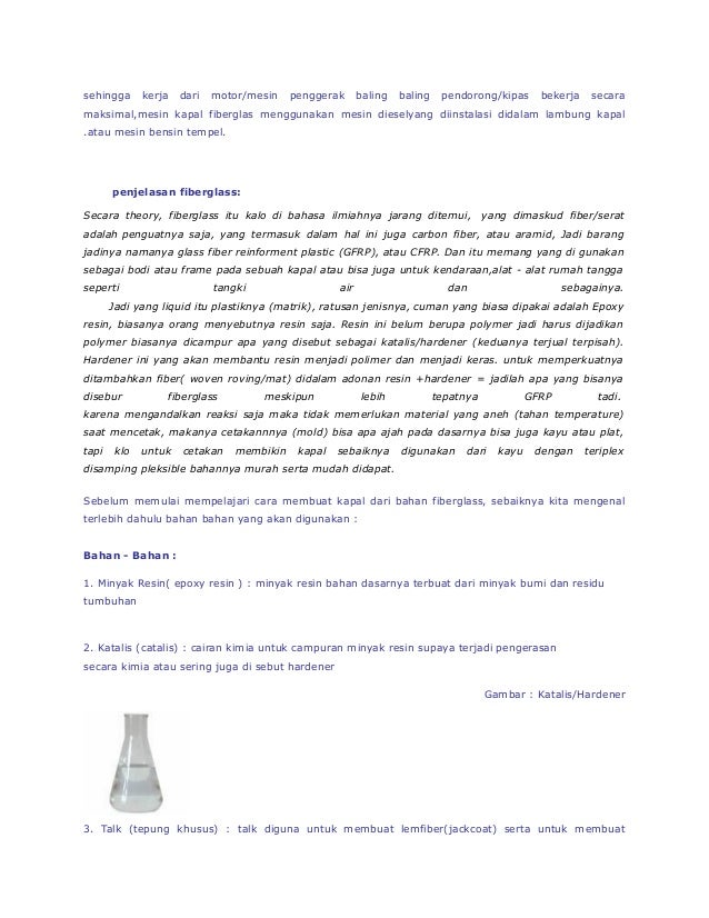 - 2. sehingga kerja dari motor/mesin penggerak baling baling pendorong/kipas bekerja secara maksimal,mesin kapal fiberglas menggunakan mesin dieselyang diinstalasi didalam lambung kapal .atau mesin bensin tempel. penjelasan fiberglass: Secara theory, fiberglass itu kalo di bahasa ilmiahnya jarang ditemui, yang dimaskud fiber/serat adalah penguatnya saja, yang termasuk dalam hal ini juga carbon fiber, atau aramid, Jadi barang jadinya namanya glass fiber reinforment plastic (GFRP), atau CFRP. Dan itu memang yang di gunakan sebagai bodi atau frame pada sebuah kapal atau bisa juga untuk kendaraan,alat - alat rumah tangga seperti tangki air dan sebagainya. Jadi yang liquid itu plastiknya (matrik), ratusan jenisnya, cuman yang biasa dipakai adalah Epoxy resin, biasanya orang menyebutnya resin saja. Resin ini belum berupa polymer jadi harus dijadikan polymer biasanya dicampur apa yang disebut sebagai katalis/hardener (keduanya terjual terpisah). Hardener ini yang akan membantu resin menjadi polimer dan menjadi keras. untuk memperkuatnya ditambahkan fiber( woven roving/mat) didalam adonan resin +hardener = jadilah apa yang bisanya disebur fiberglass meskipun lebih tepatnya GFRP tadi. karena mengandalkan reaksi saja maka tidak memerlukan material yang aneh (tahan temperature) saat mencetak, makanya cetakannnya (mold) bisa apa ajah pada dasarnya bisa juga kayu atau plat, tapi klo untuk cetakan membikin kapal sebaiknya digunakan dari kayu dengan teriplex disamping pleksible bahannya murah serta mudah didapat. Sebelum memulai mempelajari cara membuat kapal dari bahan fiberglass, sebaiknya kita mengenal terlebih dahulu bahan bahan yang akan digunakan : Bahan - Bahan : 1. Minyak Resin( epoxy resin ) : minyak resin bahan dasarnya terbuat dari minyak bumi dan residu tumbuhan 2. Katalis (catalis) : cairan kimia untuk campuran minyak resin supaya terjadi pengerasan secara kimia atau sering juga di sebut hardener Gambar : Katalis/Hardener 3. Talk (tepung khusus) : talk diguna untuk membuat lemfiber(jackcoat) serta untuk membuat