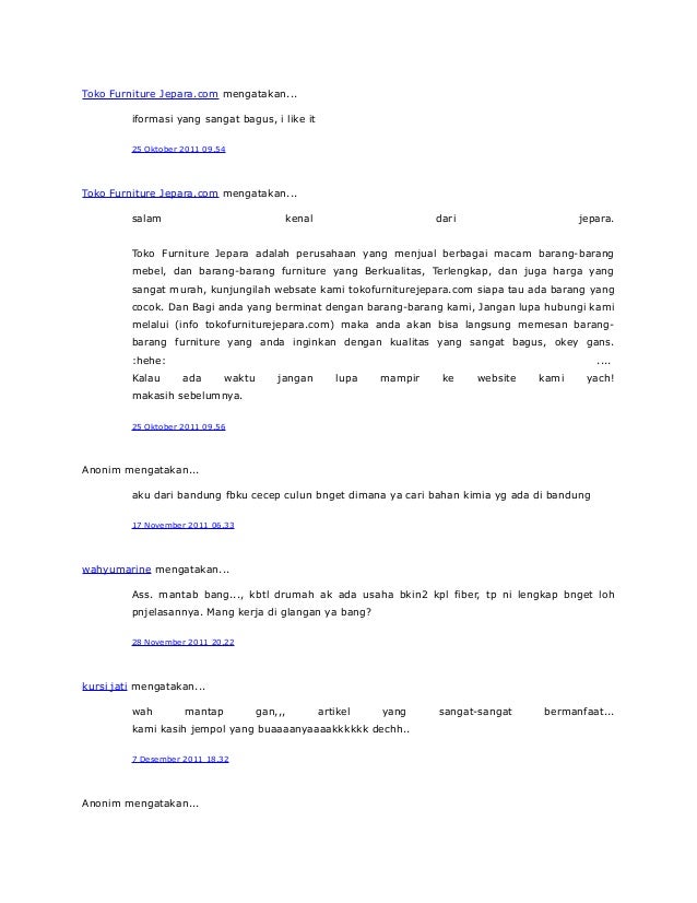 - 22. Toko Furniture Jepara.com mengatakan... iformasi yang sangat bagus, i like it 25 Oktober 2011 09.54 Toko Furniture Jepara.com mengatakan... salam kenal dari jepara. Toko Furniture Jepara adalah perusahaan yang menjual berbagai macam barang-barang mebel, dan barang-barang furniture yang Berkualitas, Terlengkap, dan juga harga yang sangat murah, kunjungilah websate kami tokofurniturejepara.com siapa tau ada barang yang cocok. Dan Bagi anda yang berminat dengan barang-barang kami, Jangan lupa hubungi kami melalui (info tokofurniturejepara.com) maka anda akan bisa langsung memesan barang- barang furniture yang anda inginkan dengan kualitas yang sangat bagus, okey gans. :hehe: .... Kalau ada waktu jangan lupa mampir ke website kami yach! makasih sebelumnya. 25 Oktober 2011 09.56 Anonim mengatakan... aku dari bandung fbku cecep culun bnget dimana ya cari bahan kimia yg ada di bandung 17 November 2011 06.33 wahyumarine mengatakan... Ass. mantab bang..., kbtl drumah ak ada usaha bkin2 kpl fiber, tp ni lengkap bnget loh pnjelasannya. Mang kerja di glangan ya bang? 28 November 2011 20.22 kursi jati mengatakan... wah mantap gan,,, artikel yang sangat-sangat bermanfaat... kami kasih jempol yang buaaaanyaaaakkkkkk dechh.. 7 Desember 2011 18.32 Anonim mengatakan...