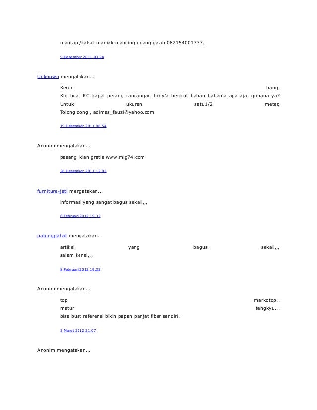 - 23. mantap /kalsel maniak mancing udang galah 082154001777. 9 Desember 2011 03.24 Unknown mengatakan... Keren bang, Klo buat RC kapal perang rancangan body'a berikut bahan bahan'a apa aja, gimana ya? Untuk ukuran satu1/2 meter, Tolong dong , adimas_fauzi@yahoo.com 19 Desember 2011 06.54 Anonim mengatakan... pasang iklan gratis www.mig74.com 26 Desember 2011 12.03 furniture-jati mengatakan... informasi yang sangat bagus sekali,,, 8 Februari 2012 19.32 patungpahat mengatakan... artikel yang bagus sekali,,, salam kenal,,, 8 Februari 2012 19.33 Anonim mengatakan... top markotop.. matur tengkyu... bisa buat referensi bikin papan panjat fiber sendiri. 5 Maret 2012 21.07 Anonim mengatakan...