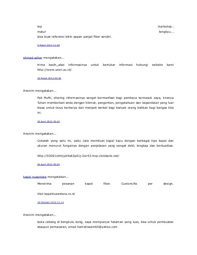 - 24. top markotop.. matur tengkyu... bisa buat referensi bikin papan panjat fiber sendiri. 5 Maret 2012 21.08 ahmad azhar mengatakan... trima kasih,,atas informasinya untuk bertukar informasi hubungi website kami http://www.unsri.ac.id/ 15 Maret 2012 00.36 Anonim mengatakan... Pak Mufti, sharing informasinya sangat bermanfaat bagi pembaca termasuk saya, kiranya Tuhan memberkati anda dengan hikmat, pengertian, pengetahuan dan kepandaian yang luar biasa untuk terus berkarya dan menjadi berkat bagi banyak orang bahkan bagi bangsa kita ini. 25 April 2012 03.42 Anonim mengatakan... Cobalah yang satu ini, yaitu cara membuat kapal kayu dengan berbagai tipe kapal dan ukuran menurut fungsinya dengan penjelasan yang sangat detil, lengkap dan berkualitas. http://03061otlmjyk9o63p01j-2wr53.hop.clickbank.net/ 26 April 2012 05.05 kapal nusantara mengatakan... Menerima pesanan kapal fiber. Custom/As per design. Visit kapalnusantara.co.id 19 Oktober 2012 21.14 Anonim mengatakan... buka cabang di bengkulu dong, saya mempunyai halaman yang luas, bisa untuk pembuatan ataupun pemasaran, email hamidinaam64@yahoo.com
