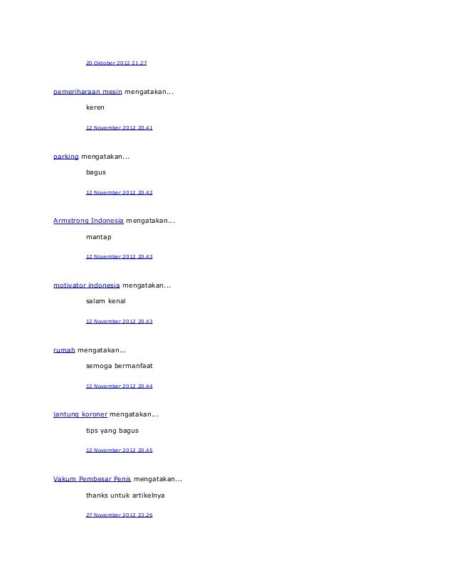 - 25. 20 Oktober 2012 21.27 pemeriharaan mesin mengatakan... keren 12 November 2012 20.41 parking mengatakan... bagus 12 November 2012 20.42 Armstrong Indonesia mengatakan... mantap 12 November 2012 20.43 motivator indonesia mengatakan... salam kenal 12 November 2012 20.43 rumah mengatakan... semoga bermanfaat 12 November 2012 20.44 jantung koroner mengatakan... tips yang bagus 12 November 2012 20.45 Vakum Pembesar Penis mengatakan... thanks untuk artikelnya 27 November 2012 23.26