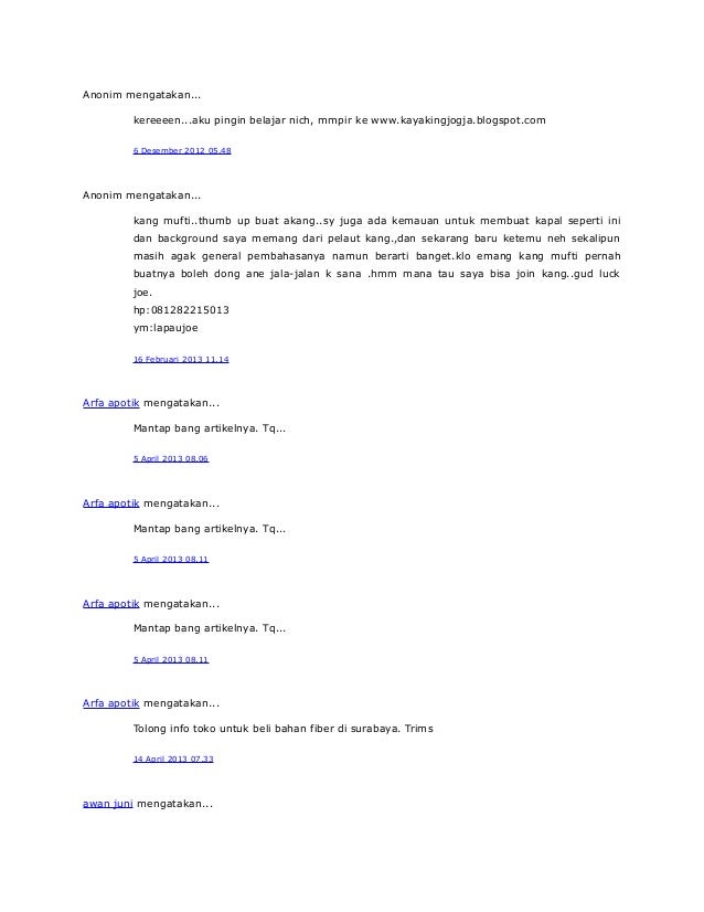 - 26. Anonim mengatakan... kereeeen...aku pingin belajar nich, mmpir ke www.kayakingjogja.blogspot.com 6 Desember 2012 05.48 Anonim mengatakan... kang mufti..thumb up buat akang..sy juga ada kemauan untuk membuat kapal seperti ini dan background saya memang dari pelaut kang.,dan sekarang baru ketemu neh sekalipun masih agak general pembahasanya namun berarti banget.klo emang kang mufti pernah buatnya boleh dong ane jala-jalan k sana .hmm mana tau saya bisa join kang..gud luck joe. hp:081282215013 ym:lapaujoe 16 Februari 2013 11.14 Arfa apotik mengatakan... Mantap bang artikelnya. Tq... 5 April 2013 08.06 Arfa apotik mengatakan... Mantap bang artikelnya. Tq... 5 April 2013 08.11 Arfa apotik mengatakan... Mantap bang artikelnya. Tq... 5 April 2013 08.11 Arfa apotik mengatakan... Tolong info toko untuk beli bahan fiber di surabaya. Trims 14 April 2013 07.33 awan juni mengatakan...