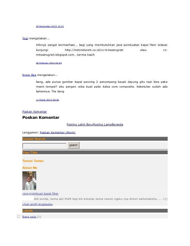 - 29. 24 November 2013 15.31 Yogi mengatakan... infonya sangat bermanfaat... bagi yang membutuhkan jasa pembuatan kapal fiber silakan kunjungi http://indonetwork.co.id/cv-minaanugrah atau cv- minaanugrah.blogspot.com...terima kasih 26 Februari 2014 06.05 Erwin Eka mengatakan... bang, ada punya gambar kapal pancing 2 penumpang kayak dayung gitu tapi bisa pake mesin tempel? aku pengen coba buat pake balsa core composite. Kebetulan sudah ada bahannya. Tks bang 11 Maret 2014 08.46 Poskan Komentar Poskan Komentar Posting Lebih BaruPosting LamaBeranda Langganan: Poskan Komentar (Atom) Google Search search Your Title Teman Teman About Me cara membuat kapal fiber Asli sunda, nama asli Mufti tapi klo kenalan sama cewek ngaku nya Anton wahahahaha..... =)) Lihat profil lengkapku Labels Baca saja (1)