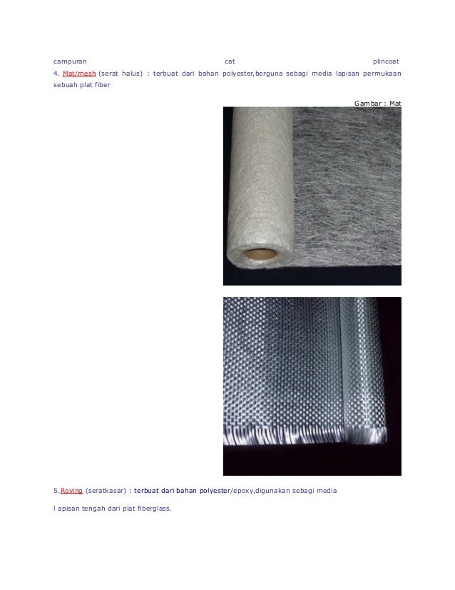 - 3. campuran cat plincoat 4. Mat/mesh (serat halus) : terbuat dari bahan polyester,berguna sebagi media lapisan permukaan sebuah plat fiber Gambar : Mat 5.Roving (seratkasar) : terbuat dari bahan polyester/epoxy,digunakan sebagi media l apisan tengah dari plat fiberglass.