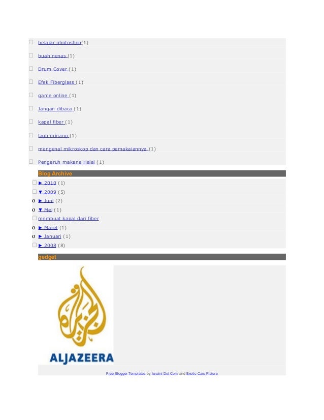 - 30. belajar photoshop(1) buah nenas (1) Drum Cover (1) Efek Fiberglass (1) game online (1) Jangan dibaca (1) kapal fiber (1) lagu minang (1) mengenal mikroskop dan cara pemakaiannya (1) Pengaruh makana Halal (1) Blog Archive ► 2010 (1) ▼ 2009 (5) o ► Juni (2) o ▼ Mei (1) membuat kapal dari fiber o ► Maret (1) o ► Januari (1) ► 2008 (8) gedget Free Blogger Templates by Isnaini Dot Com and Exotic Cars Picture
