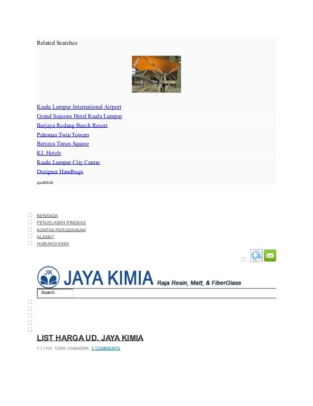 - 31. Related Searches ? Kuala Lumpur International Airport Grand Seasons Hotel Kuala Lumpur Berjaya Redang Beach Resort Petronas Twin Towers Berjaya Times Square KL Hotels Kuala Lumpur City Centre Designer Handbags qualitink BERANDA PENJELASAN RINGKAS KONTAK PERUSAHAAN ALAMAT HUBUNGI KAMI Search BERANDA HARGA BARANG PRODUK» INFO PERUSAHAAN» HUBUNGI KAMI LIST HARGA UD. JAYA KIMIA 3:33 PM TONY CHANDRA 3 COMMENTS