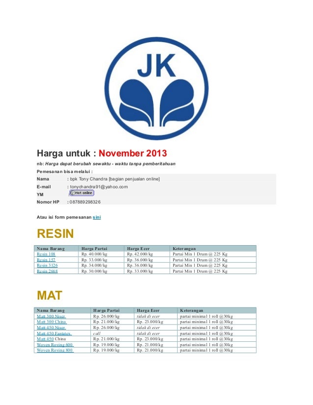 - 32. Harga untuk : November 2013 nb: Harga dapat berubah sewaktu - waktu tanpa pemberitahuan Pemesanan bisa melalui : Nama : bpk Tony Chandra [bagian penjualan online] E-mail : tonychandra91@yahoo.com YM : Nomor HP : 087889298326 Atau isi form pemesanan sini RESIN Nama Barang Harga Partai Harga Ecer Keterangan Resin 108 Rp. 40.000/kg Rp. 42.000/kg Partai Min 1 Drum @ 225 Kg Resin 157 Rp. 33.000/kg Rp. 36.000/kg Partai Min 1 Drum @ 225 Kg Resin 3126 Rp. 34.000/kg Rp. 36.000/kg Partai Min 1 Drum @ 225 Kg Resin 2668 Rp. 30.000/kg Rp. 33.000/kg Partai Min 1 Drum @ 225 Kg MAT Nama Barang Harga Partai Harga Ecer Keterangan Matt 300 Niser Rp. 26.000/kg tidak di ecer partai minimal 1 roll @30kg Matt 300 China Rp. 21.000/kg Rp. 23.000/kg partai minimal 1 roll @30kg Matt 450 Niser Rp. 26.000/kg tidak di ecer partai minimal 1 roll @30kg Matt 450 Fantatex call tidak di ecer partai minimal 1 roll @30kg Matt 450 China Rp. 21.000/kg Rp. 23.000/kg partai minimal 1 roll @30kg Woven Roving 600 Rp. 19.000/kg Rp. 21.000/kg partai minimal 1 roll @30kg Woven Roving 800 Rp. 19.000/kg Rp. 21.000/kg partai minimal 1 roll @30kg