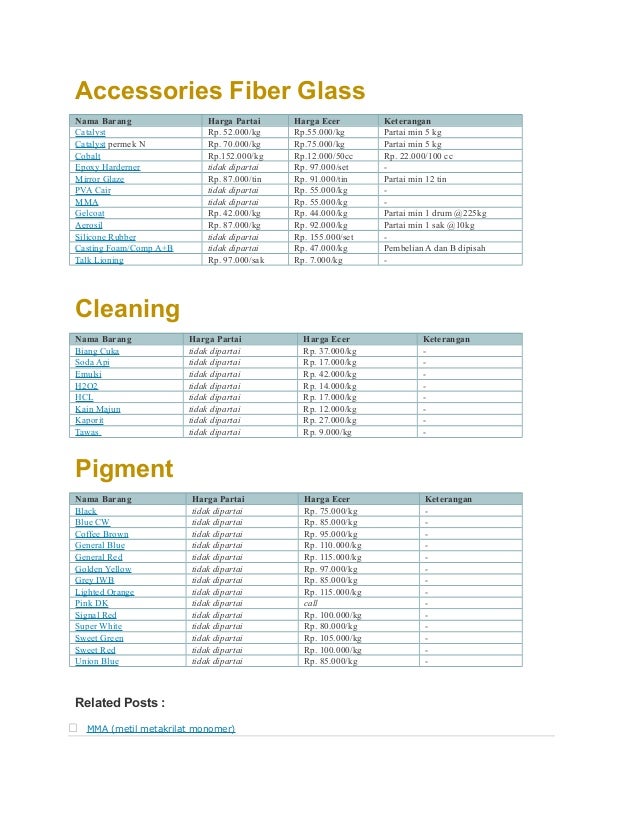 - 33. Accessories Fiber Glass Nama Barang Harga Partai Harga Ecer Keterangan Catalyst Rp. 52.000/kg Rp.55.000/kg Partai min 5 kg Catalyst permek N Rp. 70.000/kg Rp.75.000/kg Partai min 5 kg Cobalt Rp.152.000/kg Rp.12.000/50cc Rp. 22.000/100 cc Epoxy Harderner tidak dipartai Rp. 97.000/set - Mirror Glaze Rp. 87.000/tin Rp. 91.000/tin Partai min 12 tin PVA Cair tidak dipartai Rp. 55.000/kg - MMA tidak dipartai Rp. 55.000/kg - Gelcoat Rp. 42.000/kg Rp. 44.000/kg Partai min 1 drum @225kg Aerosil Rp. 87.000/kg Rp. 92.000/kg Partai min 1 sak @10kg Silicone Rubber tidak dipartai Rp. 155.000/set - Casting Foam/Comp A+B tidak dipartai Rp. 47.000/kg Pembelian A dan B dipisah Talk Lioning Rp. 97.000/sak Rp. 7.000/kg - Cleaning Nama Barang Harga Partai Harga Ecer Keterangan Biang Cuka tidak dipartai Rp. 37.000/kg - Soda Api tidak dipartai Rp. 17.000/kg - Emulsi tidak dipartai Rp. 42.000/kg - H2O2 tidak dipartai Rp. 14.000/kg - HCL tidak dipartai Rp. 17.000/kg - Kain Majun tidak dipartai Rp. 12.000/kg - Kaporit tidak dipartai Rp. 27.000/kg - Tawas tidak dipartai Rp. 9.000/kg - Pigment Nama Barang Harga Partai Harga Ecer Keterangan Black tidak dipartai Rp. 75.000/kg - Blue CW tidak dipartai Rp. 85.000/kg - Coffee Brown tidak dipartai Rp. 95.000/kg - General Blue tidak dipartai Rp. 110.000/kg - General Red tidak dipartai Rp. 115.000/kg - Golden Yellow tidak dipartai Rp. 97.000/kg - Grey IWB tidak dipartai Rp. 85.000/kg - Lighted Orange tidak dipartai Rp. 115.000/kg - Pink DK tidak dipartai call - Signal Red tidak dipartai Rp. 100.000/kg - Super White tidak dipartai Rp. 80.000/kg - Sweet Green tidak dipartai Rp. 105.000/kg - Sweet Red tidak dipartai Rp. 100.000/kg - Union Blue tidak dipartai Rp. 85.000/kg - Related Posts : csm, jayakimia, kimia, list, Mat, resin MMA (metil metakrilat monomer)