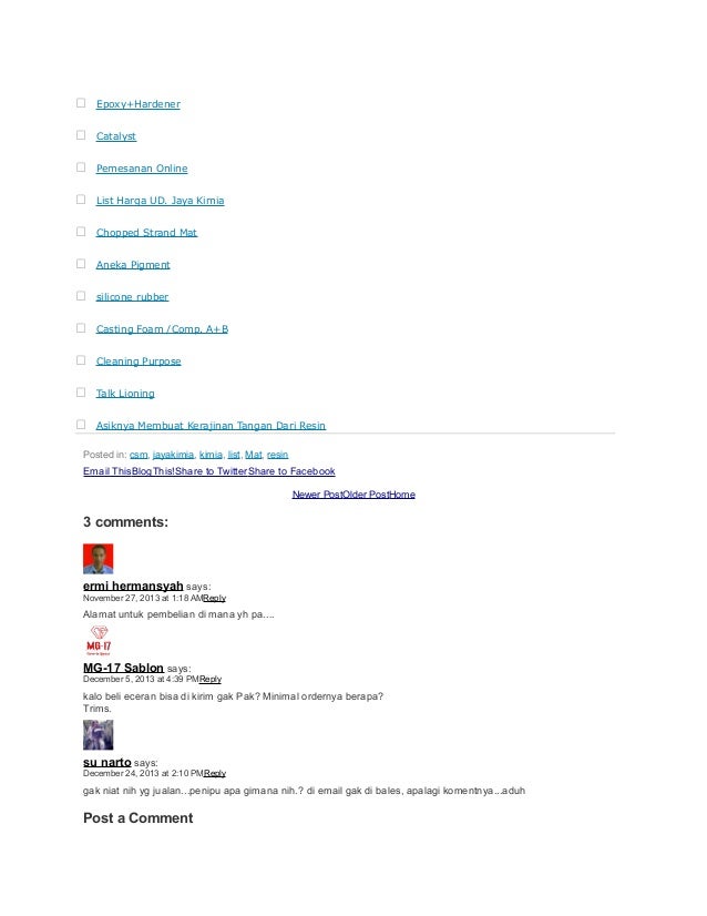 - 34. Epoxy+Hardener Catalyst Pemesanan Online List Harga UD. Jaya Kimia Chopped Strand Mat Aneka Pigment silicone rubber Casting Foam /Comp. A+B Cleaning Purpose Talk Lioning Asiknya Membuat Kerajinan Tangan Dari Resin Posted in: csm, jayakimia, kimia, list, Mat, resin Email ThisBlogThis!Share to TwitterShare to Facebook Newer PostOlder PostHome 3 comments: ermi hermansyah says: November 27, 2013 at 1:18 AMReply Alamat untuk pembelian di mana yh pa.... MG-17 Sablon says: December 5, 2013 at 4:39 PMReply kalo beli eceran bisa di kirim gak Pak? Minimal ordernya berapa? Trims. su narto says: December 24, 2013 at 2:10 PMReply gak niat nih yg jualan...penipu apa gimana nih.? di email gak di bales, apalagi komentnya...aduh Post a Comment