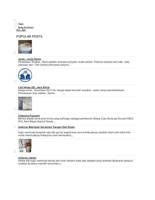 - 35. Popular Tags Blog Archives IKLAN POPULAR POSTS Jenis - Jenis Resin Penjelasan Singkat : Resin adalah senyawa polymer rantai karbon. Polymer berasal dari kata –poly (banyak) dan –mer (ikatan).Senyawa polyme... List Harga UD. Jaya Kimia Harga untuk : November 2013 nb: Harga dapat berubah sewaktu - waktu tanpa pemberitahuan Pemesanan bisa melalui : Nama ... Cleaning Purpose Berikut adalah jenis jenis kimia yang berfungsi sebagai pembersih. Biang Cuka Soda api Emulsi H2O2 HCL Kain Majun Kaporit Tawas ... Asiknya Membuat Kerajinan Tangan Dari Resin Ingin membuat kerajinan tapi kita ga tau bagaimana cara membuatnya, pastilah akan sulit untuk kita mulai membuatnya.Walaupun cara membuatny... silicone rubber Ketika kita ingin membuat benda dari resin dimana tidak ada cetakan yang tersedia dipasaran ataupun cetakan tersebut memiliki kerumitan y...