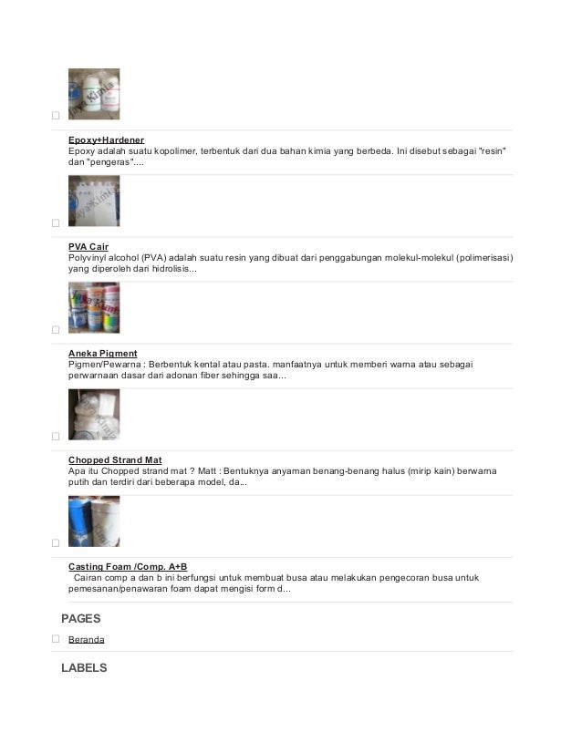 - 36. Epoxy+Hardener Epoxy adalah suatu kopolimer, terbentuk dari dua bahan kimia yang berbeda. Ini disebut sebagai "resin" dan "pengeras".... PVA Cair Polyvinyl alcohol (PVA) adalah suatu resin yang dibuat dari penggabungan molekul-molekul (polimerisasi) yang diperoleh dari hidrolisis... Aneka Pigment Pigmen/Pewarna : Berbentuk kental atau pasta. manfaatnya untuk memberi warna atau sebagai perwarnaan dasar dari adonan fiber sehingga saa... Chopped Strand Mat Apa itu Chopped strand mat ? Matt : Bentuknya anyaman benang-benang halus (mirip kain) berwarna putih dan terdiri dari beberapa model, da... Casting Foam /Comp. A+B Cairan comp a dan b ini berfungsi untuk membuat busa atau melakukan pengecoran busa untuk pemesanan/penawaran foam dapat mengisi form d... PAGES Beranda LABELS