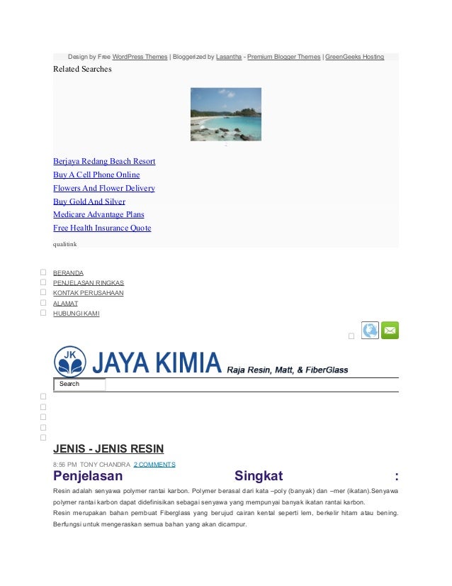 - 40. Design by Free WordPress Themes | Bloggerized by Lasantha - Premium Blogger Themes | GreenGeeks Hosting Related Searches ? Berjaya Redang Beach Resort Buy A Cell Phone Online Flowers And Flower Delivery Buy Gold And Silver Medicare Advantage Plans Free Health Insurance Quote qualitink BERANDA PENJELASAN RINGKAS KONTAK PERUSAHAAN ALAMAT HUBUNGI KAMI Search BERANDA HARGA BARANG PRODUK» INFO PERUSAHAAN» HUBUNGI KAMI JENIS - JENIS RESIN 8:56 PM TONY CHANDRA 2 COMMENTS Penjelasan Singkat : Resin adalah senyawa polymer rantai karbon. Polymer berasal dari kata –poly (banyak) dan –mer (ikatan).Senyawa polymer rantai karbon dapat didefinisikan sebagai senyawa yang mempunyai banyak ikatan rantai karbon. Resin merupakan bahan pembuat Fiberglass yang berujud cairan kental seperti lem, berkelir hitam atau bening. Berfungsi untuk mengeraskan semua bahan yang akan dicampur.