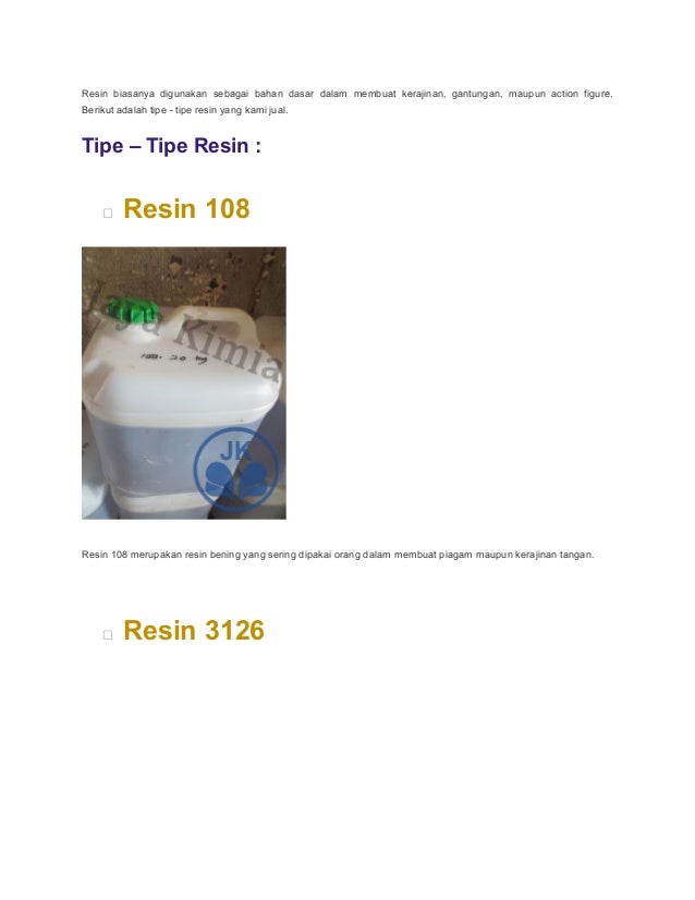 - 41. Resin biasanya digunakan sebagai bahan dasar dalam membuat kerajinan, gantungan, maupun action figure. Berikut adalah tipe - tipe resin yang kami jual. Tipe – Tipe Resin : Resin 108 Resin 108 merupakan resin bening yang sering dipakai orang dalam membuat piagam maupun kerajinan tangan. Resin 3126