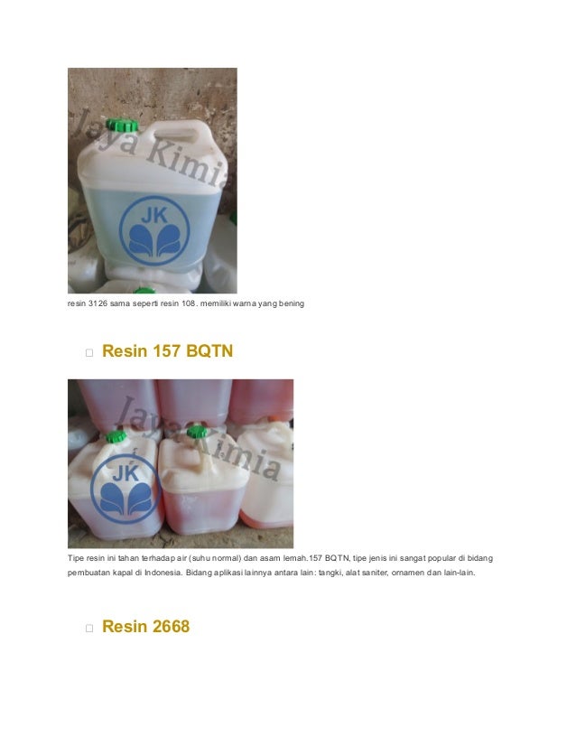 - 42. resin 3126 sama seperti resin 108. memiliki warna yang bening Resin 157 BQTN Tipe resin ini tahan terhadap air (suhu normal) dan asam lemah.157 BQTN, tipe jenis ini sangat popular di bidang pembuatan kapal di Indonesia. Bidang aplikasi lainnya antara lain: tangki, alat saniter, ornamen dan lain-lain. Resin 2668