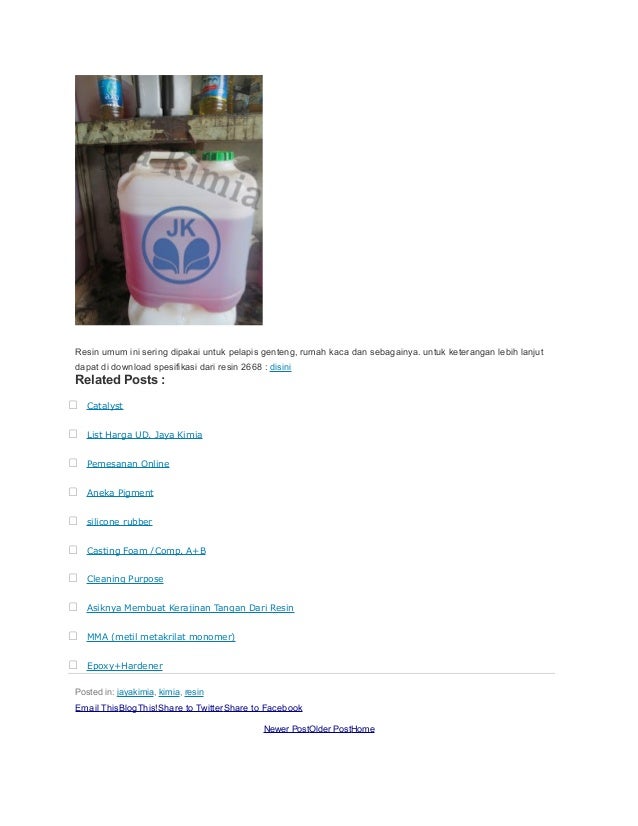 - 43. Resin umum ini sering dipakai untuk pelapis genteng, rumah kaca dan sebagainya. untuk keterangan lebih lanjut dapat di download spesifikasi dari resin 2668 : disini Related Posts : jayakimia, kimia, resin Catalyst List Harga UD. Jaya Kimia Pemesanan Online Aneka Pigment silicone rubber Casting Foam /Comp. A+B Cleaning Purpose Asiknya Membuat Kerajinan Tangan Dari Resin MMA (metil metakrilat monomer) Epoxy+Hardener Posted in: jayakimia, kimia, resin Email ThisBlogThis!Share to TwitterShare to Facebook Newer PostOlder PostHome