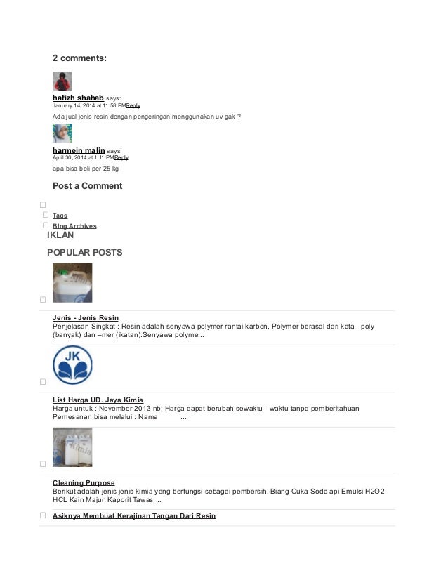 - 44. 2 comments: hafizh shahab says: January 14, 2014 at 11:58 PMReply Ada jual jenis resin dengan pengeringan menggunakan uv gak ? harmein malin says: April 30, 2014 at 1:11 PMReply apa bisa beli per 25 kg Post a Comment Popular Tags Blog Archives IKLAN POPULAR POSTS Jenis - Jenis Resin Penjelasan Singkat : Resin adalah senyawa polymer rantai karbon. Polymer berasal dari kata –poly (banyak) dan –mer (ikatan).Senyawa polyme... List Harga UD. Jaya Kimia Harga untuk : November 2013 nb: Harga dapat berubah sewaktu - waktu tanpa pemberitahuan Pemesanan bisa melalui : Nama ... Cleaning Purpose Berikut adalah jenis jenis kimia yang berfungsi sebagai pembersih. Biang Cuka Soda api Emulsi H2O2 HCL Kain Majun Kaporit Tawas ... Asiknya Membuat Kerajinan Tangan Dari Resin
