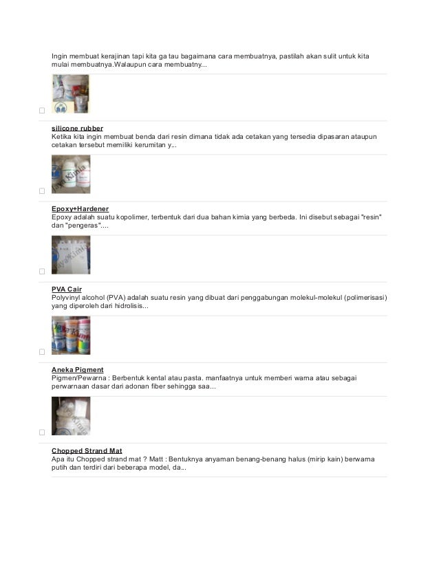 - 45. Ingin membuat kerajinan tapi kita ga tau bagaimana cara membuatnya, pastilah akan sulit untuk kita mulai membuatnya.Walaupun cara membuatny... silicone rubber Ketika kita ingin membuat benda dari resin dimana tidak ada cetakan yang tersedia dipasaran ataupun cetakan tersebut memiliki kerumitan y... Epoxy+Hardener Epoxy adalah suatu kopolimer, terbentuk dari dua bahan kimia yang berbeda. Ini disebut sebagai "resin" dan "pengeras".... PVA Cair Polyvinyl alcohol (PVA) adalah suatu resin yang dibuat dari penggabungan molekul-molekul (polimerisasi) yang diperoleh dari hidrolisis... Aneka Pigment Pigmen/Pewarna : Berbentuk kental atau pasta. manfaatnya untuk memberi warna atau sebagai perwarnaan dasar dari adonan fiber sehingga saa... Chopped Strand Mat Apa itu Chopped strand mat ? Matt : Bentuknya anyaman benang-benang halus (mirip kain) berwarna putih dan terdiri dari beberapa model, da...