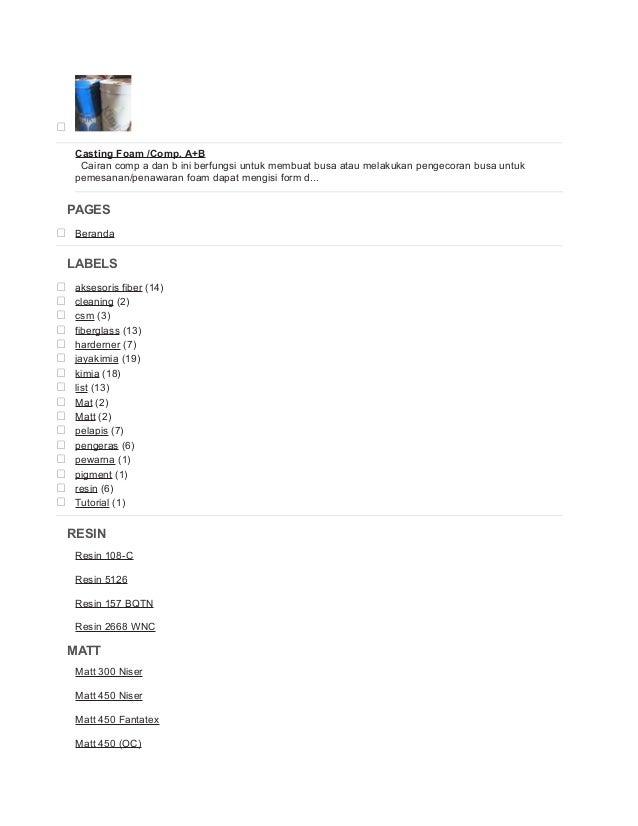 - 46. Casting Foam /Comp. A+B Cairan comp a dan b ini berfungsi untuk membuat busa atau melakukan pengecoran busa untuk pemesanan/penawaran foam dapat mengisi form d... PAGES Beranda LABELS aksesoris fiber (14) cleaning (2) csm (3) fiberglass (13) harderner (7) jayakimia (19) kimia (18) list (13) Mat (2) Matt (2) pelapis (7) pengeras (6) pewarna (1) pigment (1) resin (6) Tutorial (1) RESIN Resin 108-C Resin 5126 Resin 157 BQTN Resin 2668 WNC MATT Matt 300 Niser Matt 450 Niser Matt 450 Fantatex Matt 450 (OC)
