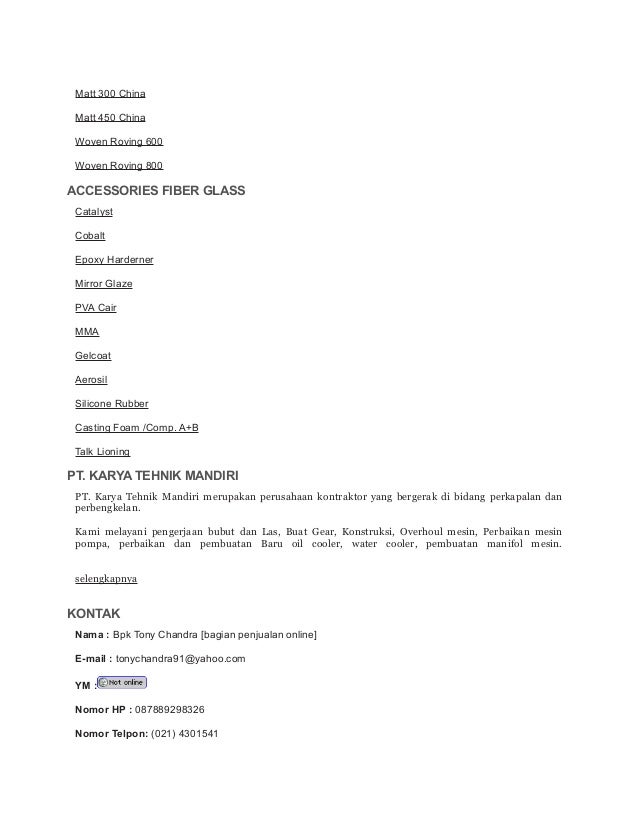 - 47. Matt 300 China Matt 450 China Woven Roving 600 Woven Roving 800 ACCESSORIES FIBER GLASS Catalyst Cobalt Epoxy Harderner Mirror Glaze PVA Cair MMA Gelcoat Aerosil Silicone Rubber Casting Foam /Comp. A+B Talk Lioning PT. KARYA TEHNIK MANDIRI PT. Karya Tehnik Mandiri merupakan perusahaan kontraktor yang bergerak di bidang perkapalan dan perbengkelan. Kami melayani pengerjaan bubut dan Las, Buat Gear, Konstruksi, Overhoul mesin, Perbaikan mesin pompa, perbaikan dan pembuatan Baru oil cooler, water cooler, pembuatan manifol mesin. selengkapnya KONTAK Nama : Bpk Tony Chandra [bagian penjualan online] E-mail : tonychandra91@yahoo.com YM : Nomor HP : 087889298326 Nomor Telpon: (021) 4301541
