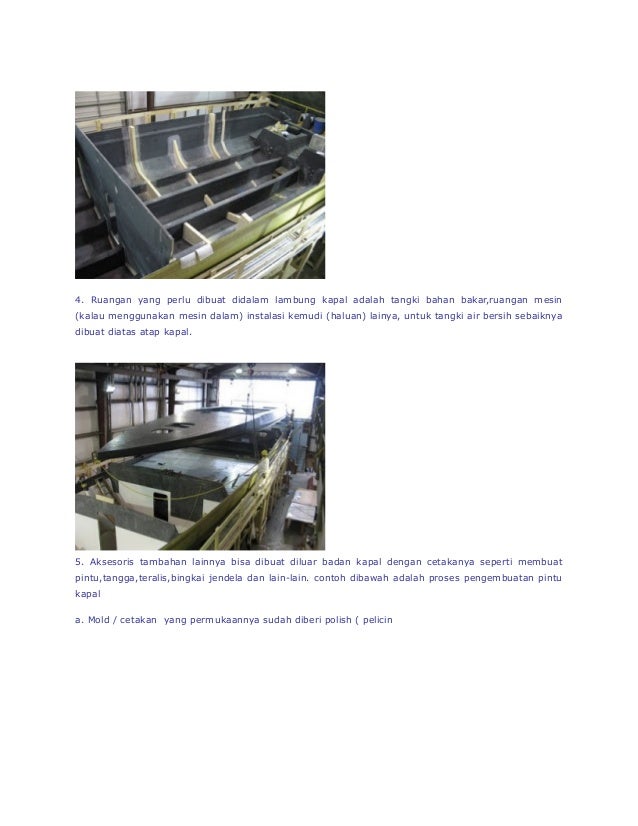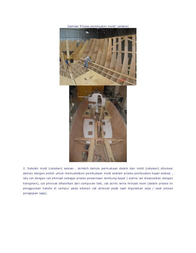- 5. Gambar Proses pembuatan mold/ cetakan 2. Setelah mold (cetakan) selesai , terlebih dahulu permukaan dalam dari mold (cetakan) dilumasi dahulu dengan polish untuk memudahkan pembukaan mold setelah proses pembuatan kapal selesai , lalu cat dengan cat plincoat sebagai proses pewarnaan lambung kapal ( warna cat disesuaikan dengan keinginan), cat plincoat dihasilkan dari campuran talk, cat acrilic serta minyak resin (dalam proses ini penggunaan katalis di campur pada adonan cat plincoat pada saat digunakan saja / saat proses pengejaan saja).