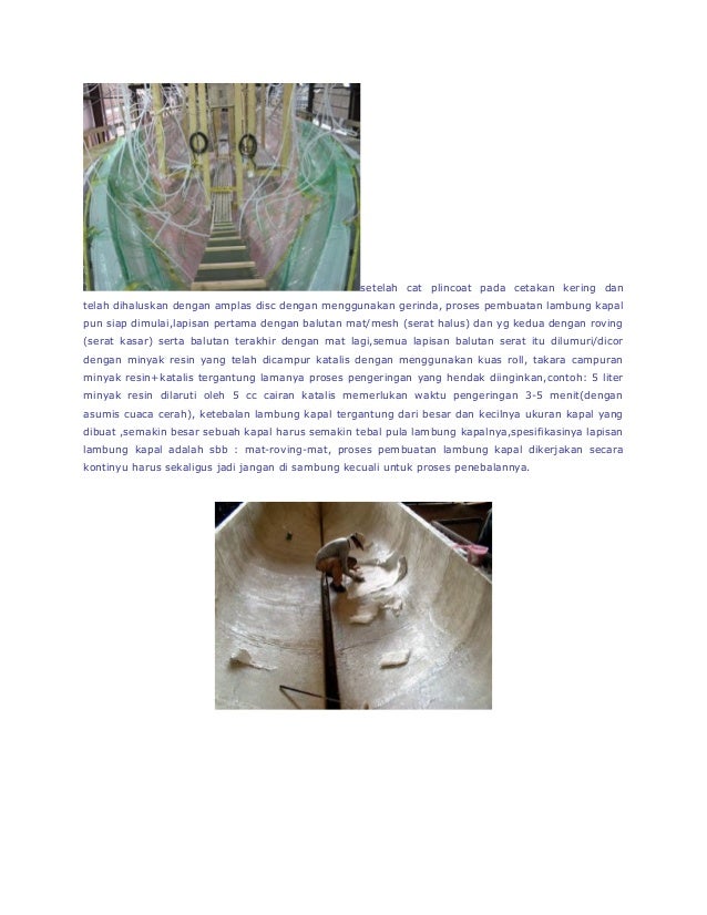 - 6. setelah cat plincoat pada cetakan kering dan telah dihaluskan dengan amplas disc dengan menggunakan gerinda, proses pembuatan lambung kapal pun siap dimulai,lapisan pertama dengan balutan mat/mesh (serat halus) dan yg kedua dengan roving (serat kasar) serta balutan terakhir dengan mat lagi,semua lapisan balutan serat itu dilumuri/dicor dengan minyak resin yang telah dicampur katalis dengan menggunakan kuas roll, takara campuran minyak resin+katalis tergantung lamanya proses pengeringan yang hendak diinginkan,contoh: 5 liter minyak resin dilaruti oleh 5 cc cairan katalis memerlukan waktu pengeringan 3-5 menit(dengan asumis cuaca cerah), ketebalan lambung kapal tergantung dari besar dan kecilnya ukuran kapal yang dibuat ,semakin besar sebuah kapal harus semakin tebal pula lambung kapalnya,spesifikasinya lapisan lambung kapal adalah sbb : mat-roving-mat, proses pembuatan lambung kapal dikerjakan secara kontinyu harus sekaligus jadi jangan di sambung kecuali untuk proses penebalannya.