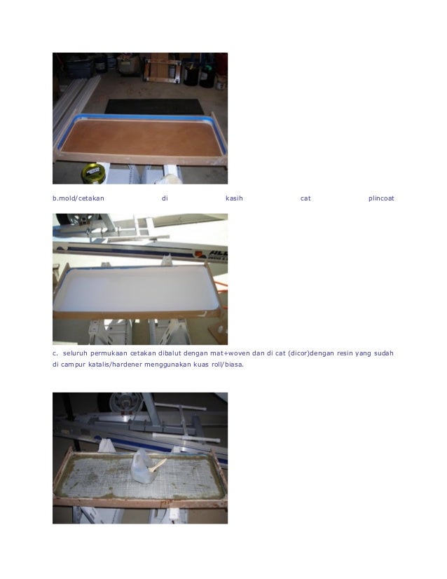 - 9. b.mold/cetakan di kasih cat plincoat c. seluruh permukaan cetakan dibalut dengan mat+woven dan di cat (dicor)dengan resin yang sudah di campur katalis/hardener menggunakan kuas roll/biasa.
